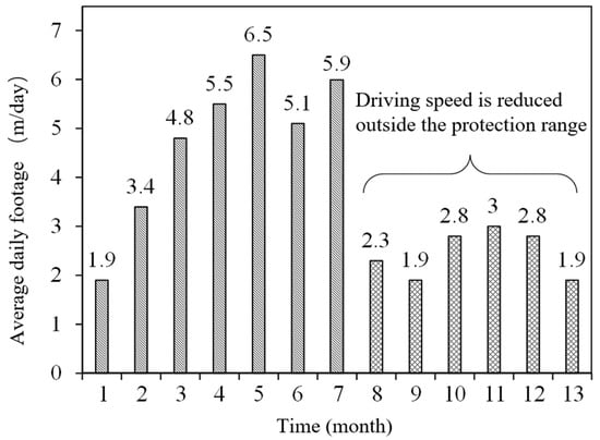 The driving speed of the #204 inlet roadway is mainly subject to the level of outburst potential. When the prediction index exceeds the limit, driving must be stopped, and anti-outburst drilling must be constructed, which inevitably slows down the driving speed. The tunneling speed of the #204 inlet roadway during tunneling is shown in Figure 11. The tunneling speed of the roadway located below the goaf is faster, with the maximum monthly average tunneling speed reaching 6.5 m/day; however, the tunneling speed of the roadway outside the goaf decreases significantly, with an average tunneling speed of less than 3 m/day.