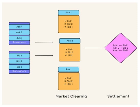 A reliable P2P energy trading platform may be established using blockchain due to its decentralized and transparent nature, which links consumers and prosumers, promoting the use of renewable energy sources. Prosumers can directly sell excess energy to nearby consumers, encouraging the growth of decentralized clean energy generation and contributing to India’s sustainability goals. By eliminating intermediaries, such as utilities and energy companies, the P2P trading process becomes more efficient, cost-effective and transparent [63]. The implementation of smart contracts further enhances automation and trust in the trading process [64]. Figure 6 illustrates the P2P energy trading process on a blockchain-based platform. Prosumers create “asks” to offer their surplus energy, while consumers place “bids” to purchase the energy. The blockchain’s decentralized and immutable nature ensures secure and trustworthy transactions by permanently recording the matches between “asks” and “bids.”