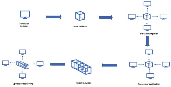 Incorporating smart meters into the P2P energy trading ecosystem offers several benefits, like enabling real-time monitoring of energy consumption, accurate billing and transparent data exchange between consumers and prosumers [68], allowing consumers to make informed decisions about their energy usage, aligning it with renewable energy availability, while prosumers receive fair compensation. The transparent data exchange enhances trust among participants, fostering cooperation and contributing to a more sustainable energy landscape. Overall, these advancements in blockchain-based P2P energy trading can empower individuals and communities to actively shape a greener and more resilient energy future in India’s Green Revolution. Figure 7 outlines the fundamental steps in the blockchain processing flow, showcasing how transactions are initiated, validated and added to the blockchain through consensus mechanisms, ultimately leading to an updated and consistent distributed ledger across the network.