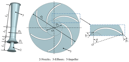 Therefore, the JET1100 jet self-priming pump is the subject of the study, as seen in Figure 1. Its general hydraulic design characteristics are a rated head H of 28 m, a rated flow rate Q of 3 m3/h, and a speed n of 2850 r/min. The injector system described in the text consists of a nozzle, a nozzle tube, an injector front chamber, and an injector rear chamber. Figure 2 illustrates the main dimensions of the injector and impeller, where the nozzle outlet diameter D1 is 9 mm, the effuser diameter D2 is 15 mm, the inlet diameter D3 is 47.5 mm, the outlet diameter D4 is 129.5 mm, the nozzle length L1 is 22 mm, the entrance region length L2 is 12.5 mm, the throat length L3 is 25 mm, the divergent cone length L4 is 62 mm, the number of blades Z is six, the blade placement angle of inlet β1 is 36°, the blade placement angle of outlet β2 is 37.5°, and the blade wrap angle φ is 106°.