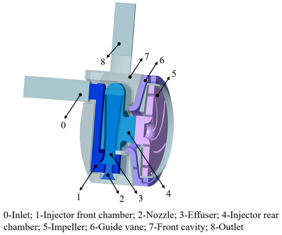 Figure 3 displays the domain of computation for the jet self-priming pump components discussed herein. When the pump turns on, the high-pressure medium in the guiding vane’s rear chamber sprays through the nozzle and into the effuser, creating a negative jet pressure at the nozzle’s inlet location. The air in the front chamber of the intake is drawn into the effuser by the negative pressure and expelled after passing the impeller and guide vane, causing the pump to self-prime. After the pump completes the self-priming process, the ejector at the front of the impeller still causes the high-pressure medium flowing from the guide vane to be ejected from the nozzle into the effuser.