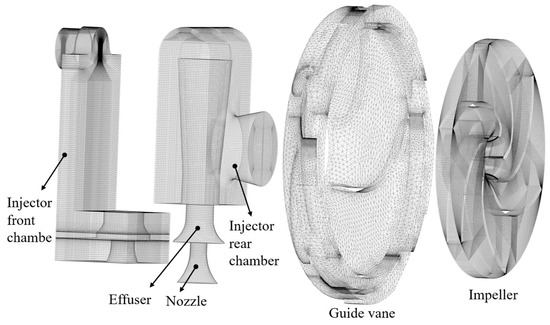 ICEM 14.5 software is employed to grid the whole fluid domain of the jet self-priming pump. Figure 4 illustrates the major computational domain’s meshing elements. Among them are the inlet part, injector structure, impeller, and outlet part of the more regular water body for hexahedral meshing. The complex front cavity and guide vane are divided using an unstructured meshing with better adaptability. The number of impeller grids is 680,000, the number of guide vane grids is 530,000, the number of nozzle grids is 210,000, the number of effuser grids is 330,000, the number of injector front chamber grids is 630,000, the number of injector rear chamber grids is 380,000, the number of grids of the remaining components is 1,130,000, and the total number of grids of the jet pump is 3,890,000. The mesh division ratio is 1.2 to 1.5, and the mesh quality is all greater than 0.6.