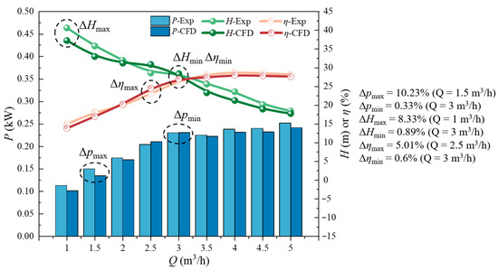 Figure 5 shows the performance of a pump during numerical simulation and testing at various flow rates. When Q is between 1 and 3 m3/h, the difference between the simulation and the test for each performance parameter of the pump fluctuates in a small range, and the head and power calculated numerically at this time have a certain deviation from the test results. When compared to an ordinary centrifugal pump, the ejector structure in the front portion of the impeller gives the flow field structure inside each component of the pump a stronger coupling impact. When Q = 3 m3/h, there is a difference of 0.33% in power, 0.89% in the head, and 0.6% in efficiency between the numerical simulation and experimental values. The numerical calculation technique used in this study is very accurate for estimating the performance and flow structure of the jet pump under rated flow settings, as shown by the fact that all three discrepancies are less than 2%. When Q > 3.5 m3/h, the simulated and experimental values of each performance parameter of the jet pump are gradually approached. In particular, when Q = 5 m3/h, the basic agreement between the simulated and experimental values of each performance parameter further demonstrates the high precision of the numerical calculation in this study.