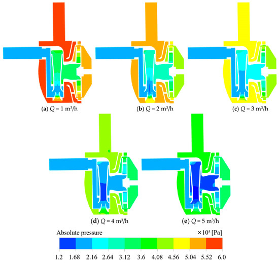 Cloud plot of pressure at the axial plane in a short jet self-priming pump at different flow rates.