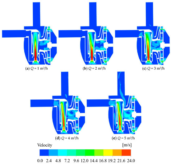 Cloud plot of velocity at the axial plane in a short jet self-priming pump at different flow rates.