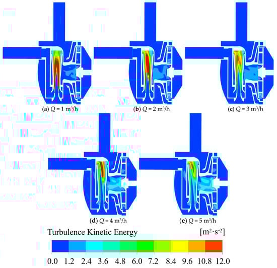 Cloud plot of turbulent kinetic energy at the axial plane in a short jet self-priming pump at different flow rates.