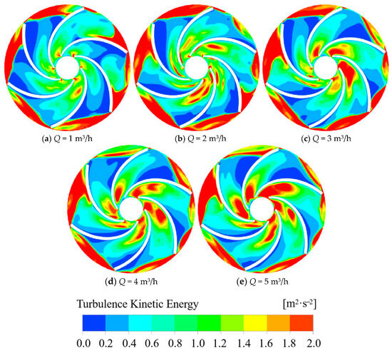 Cloud plot of turbulent kinetic energy in the midsection of the impeller at different flow rates.