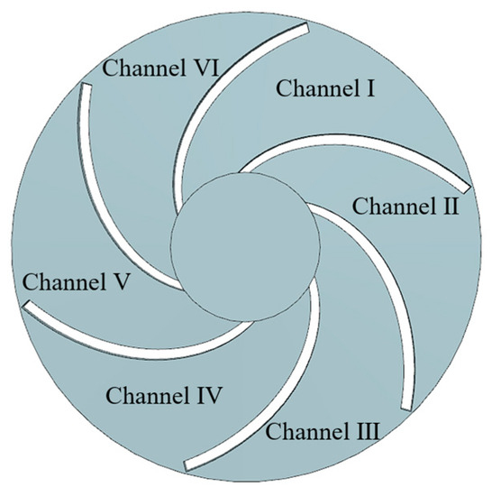 The impeller flow channel is divided into six parts, and the flow regime of each flow channel is analyzed and studied. The specific arrangement is shown in Figure 10.