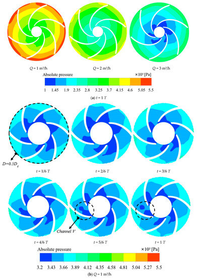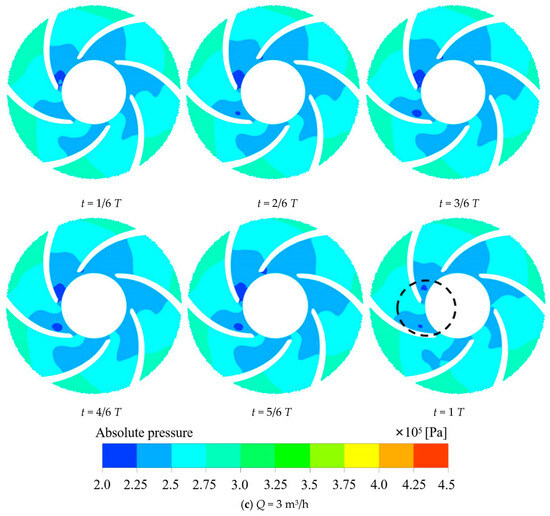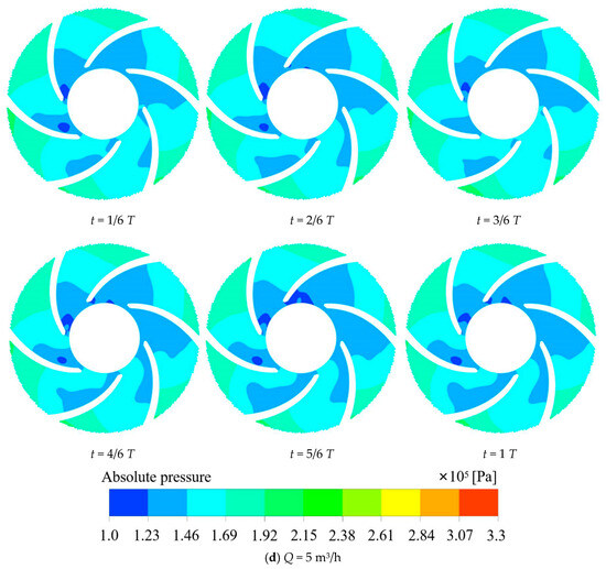Figure 11a shows the flow of media, the media in the impeller inlet pressure minimum, the pressure in the impeller channel gradually rising, and finally the impeller outlet pressure maximum, which is in line with the impeller. It has a pressurized media discharge working principle. Concurrently, it shows that as the flow rate increases, the pressure in each flow channel of the impeller gradually decreases. In Figure 11b–d, it is shown that the pressure distribution in each flow channel of the impeller is not uniform at different times under different flow rates, which may be the reason for the vibration and noise of the impeller. At low-flow conditions (Q = 1 m3/h), the range of low-pressure zones in the impeller increases and then decreases with time. When t = 5/6 T, the low-pressure zone within the flow channel V begins to segregate, indicating that unsteady flow is generated at this point. Under the rated flow condition (Q = 3 m3/h), when t =1/6 T, the region with the lowest pressure first appears in the flow channel VI. With time, at t =3/6 T, the region with the lowest pressure spreads into the flow channel V. At t = T, the region with the lowest pressure in the flow channel VI gradually disappears, and only a smaller area of the lowest pressure region exists in the flow channel I. In the case of high-flow rates (Q = 5 m3/h), low-pressure zones appeared in flow channels V, VI, and I at different moments. At this point, the minimum pressure is less than the standard atmospheric pressure value, which indicates that cavitation occurs in the impeller channel and begins to affect the flow regime of the medium in the impeller. Under high-flow conditions, the low-pressure area is mostly spread towards the back of each runner blade. This is because, as the impeller inlet flow rate increases, the impeller rotation generates centrifugal force. The flow of media in the flow path interaction generated by the secondary flow impact on the back of the impeller reduces its pressure and creates a low-pressure zone.