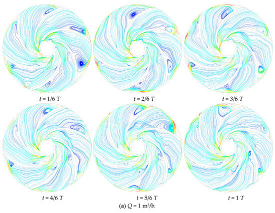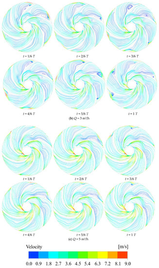 When Q = 1 m3/h, there are more vortex structures generated in each flow channel of the impeller, and there are vortices with different vortex strengths in almost every flow channel at different moments. With the change of time, the intensity of the vortex in flow channel II gradually decreases, and at t = T, only a tiny vortex exists at the impeller outlet. The vortex at the working surface of the blade in flow channel III gradually disappears, and at the same time, the strength of the vortex at the back of the blade can be monitored to gradually increase. This is due to the high impeller speed under the low-flow conditions, at different moments, the media velocity distribution entering the impeller flow channel is not uniform, the flow rate at the inlet biased towards the blade working surface is large. When Q = 3 m3/h, the vortex structure generated in each flow channel of the impeller is significantly reduced, the flow regime of the medium in the flow channel is significantly improved, and only the more significant vortex exists in flow channels I and VI. This is due to the increased ability of the impeller to do work and the increased ability to roll and suck the media into the impeller flow path, thus allowing the media to flow more smoothly in the impeller. When Q = 5 m3/h, the streamlines in the impeller channels are smoother, and only a small range of vortex structure is observed in channel VI. This is because under high-flow conditions, the increase in impeller inlet speed makes the medium enter the impeller channel at a higher speed, thus impacting the impeller channel and enhancing the flow regime inside the impeller.
