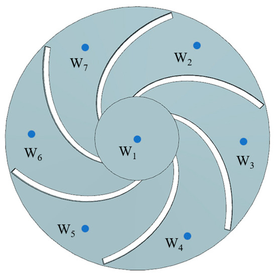 Due to the uneven pressure distribution in each runner of the impeller, a total of seven monitoring points from W1 to W7 were set up in the impeller inlet and each runner, as shown in Figure 13, to study the pressure pulsation patterns of the impeller inlet and flow channels [33,34].