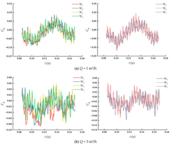 The pressure pulsations at monitoring locations W2~W7 in the impeller flow channel exhibit good periodicity at various flow levels, as illustrated in Figure 14. Because of the impact of the impeller rotation during a cycle, the pressure in the impeller flow channel exhibits alternating fluctuations. The pressure pulsation at monitoring location W1 at the impeller inlet has weak periodicity, and when the flow rate rises, the magnitude of the pressure pulsation varies noticeably. The reason for this is that the media does not flow inlet from the center of the impeller inlet because of the eccentric rotation of the impeller inlet during the flow of the medium into the impeller through the rear chamber of the injector. Pressure variations at the impeller inlet become more intense as the flow rate rises because the intensity of the medium’s eccentric spin at the impeller inlet rises along with it.