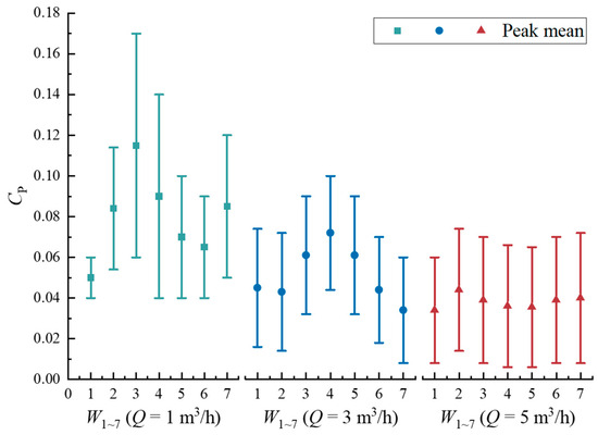 Figure 15 shows a plot of the maximum and minimum difference between the peaks and troughs of the pressure pulsations at each monitoring point during a cycle. Evidently, the peak mean of pressure pulsation is larger at Q = 1 m3/h, and the greatest disparity is observed at monitoring point W3. This is due to the fact that fluid flow may be more susceptible to blade configuration and runner shape under low-flow conditions. This leads to instabilities and discontinuities in the fluid, resulting in more irregular nonlinear vibrations. When Q = 3 m3/h, the peak mean of the pressure pulsation at each monitoring point increases and then decreases, which is more regular compared to the low-flow condition. The peak mean of the pressure pulsation at each monitoring site is comparable when Q = 5 m3/h. This is due to the faster flow rate of the fluid, the more stable flow, and the averaging of turbulence effects. Overall, the increase in flow causes the impeller to vibrate more regularly and nonlinearly, and the regular vibration helps to more accurately assess the fatigue life of the impeller components.