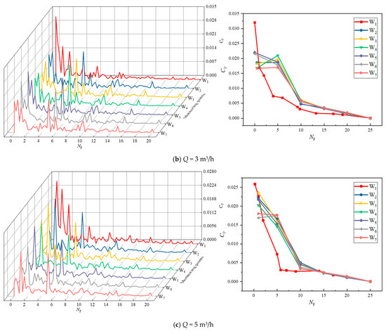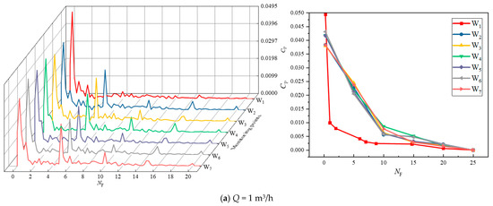 From Figure 16, it is observed that when Q = 1 m3/h, the dominant frequency of the monitoring points within the impeller is distributed around 0.25 times of the rotational frequency (0.25 F), i.e., a low-frequency region of the rotational frequency F. The secondary dominant frequency distribution of the impeller inlet monitoring point W1 is not obvious. This is due to the medium at the impeller inlet by the impeller and the injector rear chamber’s role in static and dynamic interference making the pulsate more turbulent, resulting in poor symmetry of the flow field. At rated flow (Q = 3 m3/h), the amplitude of pressure pulsation occurs at one and five times the rotational frequency and its multiple frequencies in the impeller flow channel. In the meantime, as frequency rises, pressure pulsation amplitude declines. This happens as a result of the medium’s fluctuations, which alter the pressure distribution in the impeller flow channel, during the flow from the impeller to the guide vane. The pressure pulsation at the monitoring location W1 at the impeller inlet is more frequent before 10 times the rotational frequency, and there is an significant crossover phenomenon, while after 10 times the rotational frequency, the amplitude of pressure pulsation gradually decreases and tends to level off. When Q = 5 m3/h, the pressure in the impeller runner varies more drastically, and the pressure shows an up-and-down trend. This is attributed to the fact that high-flow rates can easily induce leakage, turbulence, water flow detachment, and cavitation backflow, resulting in large pressure fluctuations.