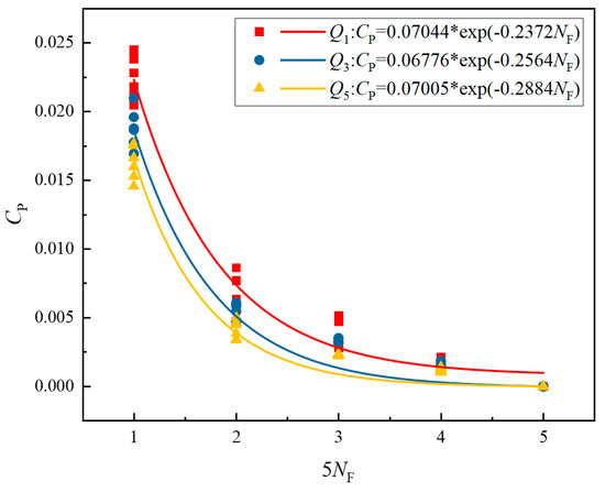 (4) For various flow rates, the amplitude of the main frequency of pressure pulsations at the impeller intake (W1) is greater than the amplitude of pressure pulsations in the impeller channel (W2~7). Furthermore, the pressure pulsation is more frequent before 10 times the rotational frequency, with no significant regularity. This illustrates that the interaction between the impeller and the rear chamber of the injector, both dynamically and statically, can have an impact on pressure pulsation. The pressure pulsation coefficients at the monitoring points (W2~7) in the impeller at different flow rates show an exponentially decreasing trend with the increase of multiples of five in the rotation frequency. Among them, the relationship equation between Cp and 5NF for low-flow condition is CP-Q1 = 0.07044 × exp(−0.2372NF), the relationship equation between Cp and 5NF for rated flow condition is CP-Q3 = 0.06776 × exp(−0.2564 NF), the relationship equation between Cp and 5NF for large flow condition is CP-Q5 = 0.07005 × exp(−0.2884 NF). These formulas can reveal the vibration characteristics of the impeller more comprehensively and provide a reference for the performance optimization of the pump.