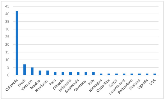 The screening phase allowed us to describe the distribution of the studies in space and time. Regarding geographical distribution, since the search string concerned a specific geographical area, the most represented country is obviously Colombia (Figure 2). However, it is interesting to note that several comparative studies also include other countries, thus underlining the existing common issues among coffee supply chain actors all around the world.