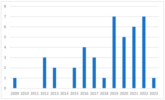 Regarding the time distribution, most studies are concentrated between 2016 and 2022 (Figure 3). The time frame of 2008–2023 was adequate for examining the recent transformations in the coffee sector. The concentration of studies in the last years shows an increasing interest on this topic and coincides with some recent significant changes in Colombia (peace process, government change, etc.) that have had an impact on the coffee chain. In this sense, the peaks in 2019, 2020, and 2022 highlight a link between these changes and some important transformations of the coffee chain in Colombia.