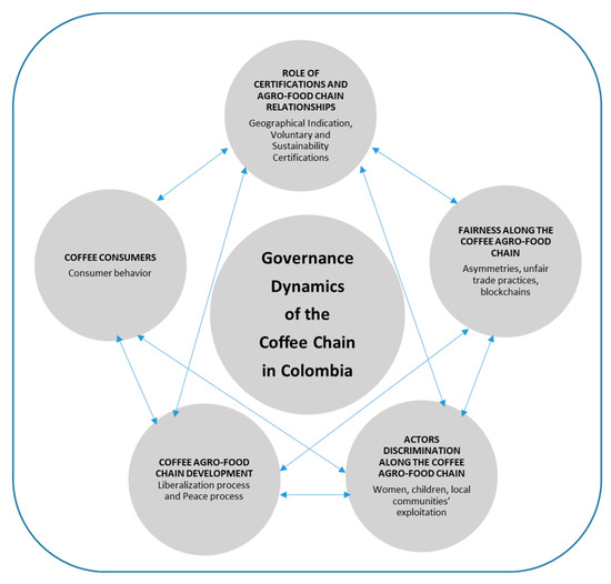 The current study presents a comprehensive review and analysis of recent articles focusing on the coffee chain governance dynamics in Colombia. The review has categorized the articles into five main areas based on their aims and themes: fairness along the coffee agro-food chain, coffee agro-food chain development, discrimination among actors in the coffee agro-food chain, coffee consumers, and the role of certifications. Each category includes sub-categories that delve into specific topics. The findings offer valuable insights into the dynamics and evolution of the Colombian coffee chain, covering all stages of the chain and providing a thorough understanding of the industry’s potential, strengths, limitations, and challenges in Colombia. The literature review identifies common issues and interrelationships among the various categories (Figure 4), enabling a multidimensional perspective that sheds light on individual problems and facilitates the formulation of future areas of research on the topic, as presented in the following sections.