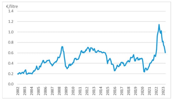 Average monthly fuel price evolution in EU fishing ports (EUR per liter), 2002–2023 (up to May 2023). Source: own calculation from EUMOFA data [1].