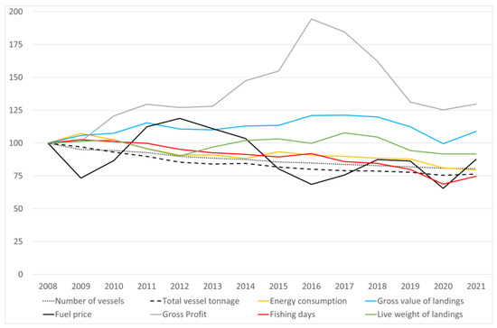 Evolution of key figures for the EU fishing fleet for the period 2008–2021 (2008 base year = 100). Source: own calculation from STECF data [2].