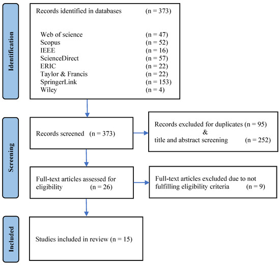 As shown in Figure 1, we considered three main selection stages, identification, screening, and eligibility evaluation. After importing the result of our searches to our reference management software (i.e., Zotero), we employed automatic and manual duplicate searching to find and remove similar studies imported from different databases. During the first screening, two researchers analyzed the suitability of the article’s abstract and title based on our eligibility criteria. If unsure, the articles were sent to the second screening. During the second screening, the full text of the articles was retrieved and carefully analyzed using our eligibility criteria. Our exclusion criteria were then refined and completed, had we identified any new criteria. Both researchers discussed their disagreements regarding the inclusion of specific articles until an agreement was reached. Quality appraisal was also conducted on the studies included in the second screening (for the quality appraisal check list, see [45,46]). Briefly, the quality appraisal criteria included six criteria for qualitative studies and six criteria for quantitative studies. Scores 0, 0.5, and 1 were used if the quality criterion was not satisfied, partially satisfied, or fully satisfied, respectively. Three quality rankings of “low”, “medium”, and “high” were used to evaluate the studies. All 15 studies met the minimum scores (ranked medium or high), and therefore, no studies were excluded during this stage. Once finalized, relevant information was extracted by the researchers from the included articles.