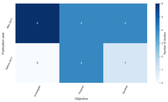 We further generated a heatmap visualizing the connection between the objectives and publication years showing how the focus of the LA research community has evolved with respect to student agency. As shown in Figure 4, before 2017, the focus of the LA research community mainly revolved around proposing design principles for supporting student agency in LA with almost no attention on investigating the key driving factors for promoting student agency and/or developing LA methods that consider fostering student agency. In the past five years, however, there has been more focus on investigating students’ and educators’ experiences about agency in LA (the elements contributing to fostering student agency). Also, more developments can be seen compared to before 2017 when it comes to designing and developing LA methods and dashboards that promote student agency. Overall, not only more research works have evolved dealing with LA in supporting agency, but also all three objectives of investigating, proposing, and developing have been more or less covered by the LA research community.