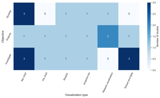 Figure 6 shows patterns related to the use of specific visualization types in the studies’ objectives. Overall, while only one article proposed using bar charts for supporting agency in LA, it has been mainly considered in developing LA methods or dashboards for supporting student agency. Also, although textual and summary tables were investigated by some studies, no studies had actually employed them in developmental work for promoting agency using LA.