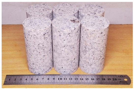 The granite samples utilized in the experiment were obtained from Baishi Town, Jining City, Shandong Province, China. In order to minimize variations, all the samples were sourced from the same parent rock that possessed a consistent texture and lacked any visible joints or cracks. The granite block was then processed into cylindrical shapes with dimensions of φ50 mm × L100 mm. The flatness of the end face of each specimen was carefully controlled to be within ±0.02 mm, in accordance with the recommendations provided by the ISRM [29]. This is illustrated in Figure 1. The average natural density and P-wave velocity of all the samples were determined to be 2.585 g/cm3 and 4266 m/s, respectively.