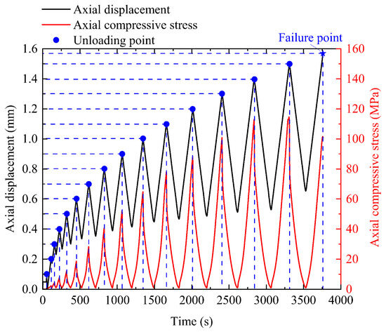 To facilitate the execution of multiple cyclic loading and unloading tests on samples subjected to different thermal treatments, a test scheme was devised. This scheme involved applying a constant lower limit under gradient loading, specifically axial displacement. The loading rate was set at 0.004 mm/s and a loading gradient of 0.1 mm was employed for each cycle. Once the specimen reached the designated axial displacement, the axial stress was unloaded using displacement control mode at a rate of 0.004 mm/s. This cycle was repeated until the sample incurred damage. It is important to note that unloading was halted when the axial stress reached 1 MPa to maintain contact between the sample’s end face and the loading platen throughout the test. The stress path for the constant lower limit cyclic loading and unloading test is depicted in Figure 3. This experiment aimed to investigate the mechanical properties and thermal damage evolution of granite samples following thermal treatment under cyclic loading.