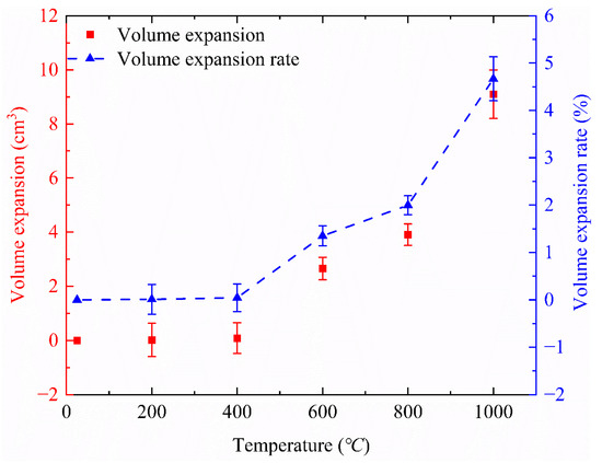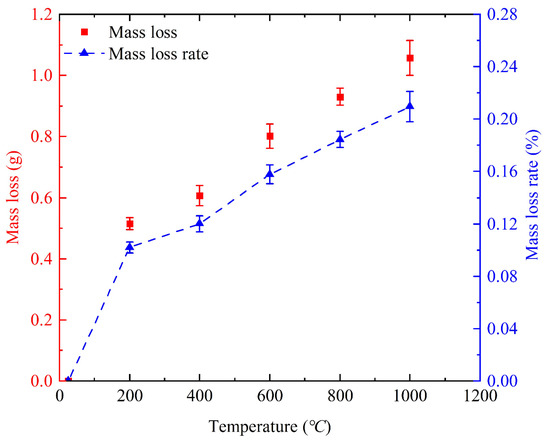 - The rate of mass loss as the thermal treatment temperature increases can be categorized into three stages. In the initial stage, the rate of mass loss exhibits the greatest variation within the temperature range of 25–200 °C. In the second stage, the rate of mass loss growth decreases as the treatment temperature ranges from 200 °C to 400 °C. In the third stage, within the treatment temperature range of 400–1000 °C, the rate of mass loss growth rebounds and stabilizes. The change in the rate of volume expansion is not significant when the treatment temperature is below 400 °C, but it increases rapidly once the treatment temperature exceeds 400 °C.