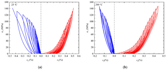 Typical stress-strain curves of specimens subjected to thermal treatment at various temperatures under uniaxial compression are presented in Figure 8, where is the axial stress, is the axial strain, and is the lateral strain. The uniaxial compressive stress-strain curve of the sample can be divided into three stages: initial compaction, elasticity, and yield. However, due to the dense nature of the granite used in this study, the yield stage is not evident. As the treatment temperature increases, the nonlinear compaction stage of the curve is prolonged and the proportion of the elastic deformation stage gradually decreases. This is because the thermal damage leads to the formation of defects such as microcracks, pores, and dislocations, which in turn increase the development of initial cracks in the sample [42]. In addition, thermal treatment significantly affects the strength and deformation characteristics of the sample. Specifically, when the treatment temperature ranges from 25 °C to 400 °C, the compressive strength of the sample decreases. On the other hand, when the treatment temperature ranges from 400 °C to 1000 °C, both the compressive strength and Young’s modulus of the specimen noticeably deteriorate, while the ductility of the specimen improves. This can be attributed to the phase transition of granite mineral particles around 600 °C and the resulting thermally induced microstructure.