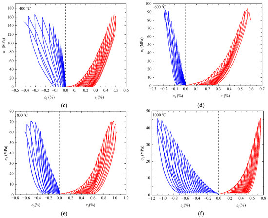 Typical stress-strain curves obtained from uniaxial cyclic loading tests of samples heated at different temperatures. (a) 25 °C; (b) 200 °C; (c) 400 °C; (d) 600 °C; (e) 800 °C, and (f) 1000 °C.