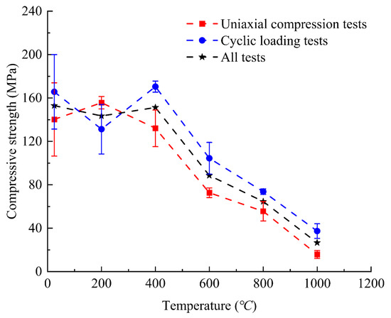 The compressive strength of specimens in the cyclic loading test is lower than that in the uniaxial compression test at a treatment temperature of 200 °C. However, the compressive strength of specimens treated at other temperatures under cyclic loading is significantly enhanced. Notably, when the treatment temperature reaches 400 °C, the compressive strength of the sample after cyclic loading is increased by 29.1%. This strengthening effect under cyclic loading has also been confirmed by previous studies [51,52]. There are two main reasons for this strengthening effect. First, cyclic loading and unloading in the early stage causes adjustment and compaction of the internal microstructure of the rock. Second, when the axial stress is discharged, the debris formed by the shear slip of the new fracture surface of the rock fills nearby pores, thereby improving the friction between the fracture surfaces and increasing the strength of the rock sample [53,54]. Additionally, compared with samples that are not subjected to thermal treatment, the compressive strength of samples heated at 400 °C under cyclic loading increases. This may be attributed to the combined effects of cyclic loading and the thermal effects [26].