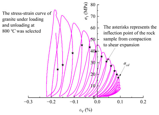 The crack damage threshold represents the initial stress during the unstable development stage of a crack. It is determined by identifying the inflection point at which the volumetric strain curve of the rock sample transitions from compaction to dilatancy. The method for determining this threshold is illustrated in Figure 11 [55,56].