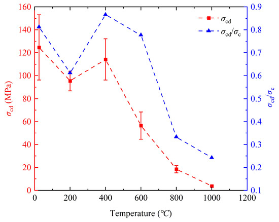 Figure 12 illustrates the variations in the crack damage threshold and the ratio between the crack damage threshold and the average uniaxial compressive strength of specimens (/) in the uniaxial compression test at different treatment temperatures. At room temperature (25 °C), of the sample is 124.64 MPa. However, at a thermal treatment temperature of 200 °C, the crack damage threshold decreases to 95.37 MPa. As the treatment temperature increases to 400 °C, the crack damage threshold increases to 114.26 MPa. Moreover, within the temperature range of 400–1000 °C, the crack damage threshold consistently decreases with increasing treatment temperature, reaching a minimum value of 3.82 MPa at 1000 °C. The trend of / with treatment temperature is similar to that of . However, it is important to note that / reaches its maximum value at a treatment temperature of 400 °C, which further supports the notion that the thermal hardening phenomenon strengthens the initial stress of damage at 400 °C.