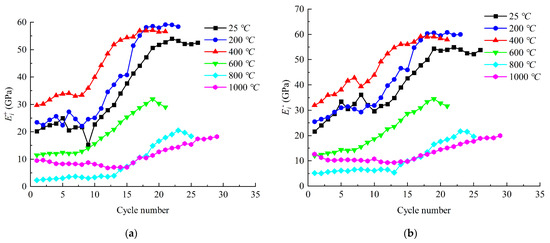 Typical variations in secant modulus of samples heated at different temperatures under uniaxial cyclic loading tests with cycle number: (a) loading secant modulus and (b) unloading secant modulus.