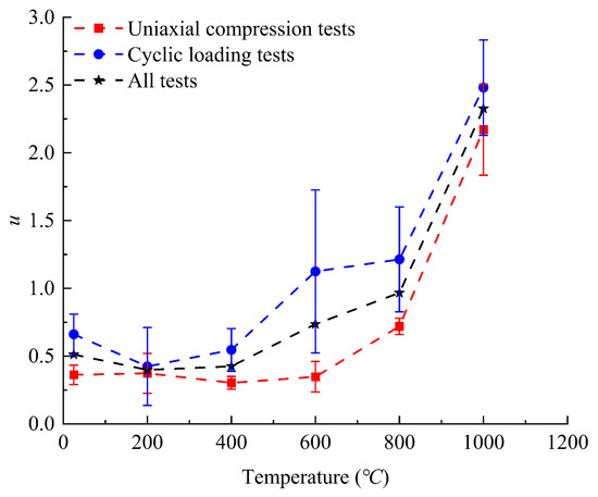 Poisson’s ratio u is determined by the ratio of lateral strain to longitudinal strain within the elastic deformation range of the sample. The variation in Poisson’s ratio with temperature is illustrated in Figure 17. The Poisson’s ratio of the rock sample under cyclic loading and unloading is determined by the ratio of lateral strain to longitudinal strain in the elastic section of the outer envelope curve at each unloading point. For the sample subjected to cyclic loading, there is a significant dispersion in results. This observation was also made by Zhang et al. [58]. The dispersion may be attributed to the discontinuous and complex displacement of microcracks under cyclic loading [28]. Additionally, the anisotropy of rock samples and the alteration in mineral composition after thermal treatment at different temperatures could also contribute to the notable dispersion [61]. However, with the exception of the samples treated at 200 °C, the Poisson ratios of the samples significantly increase after cyclic loading compared with monotonic loading. This suggests that cyclic loading fully expands the lateral deformation of the sample. Additionally, the Poisson ratio of the sample increases significantly when the treatment temperature exceeds 600 °C. There are two main reasons for this phenomenon. First, the change in the mineral composition of the rock sample after treatment at high temperature reduces the cohesion between mineral particles, making the rock sample more susceptible to lateral deformation under external loading. Second, the initiation of thermally induced microcracks causes the deformation of the sample to spread along the macrocracks, including lateral cracks.