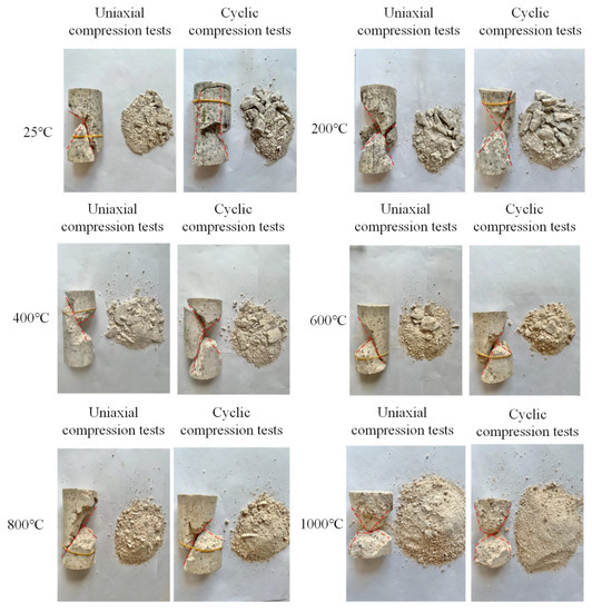 Figure 20 illustrates the failure patterns observed in typical rock samples. The findings indicate that, under normal temperature conditions, the primary mode of fracture in the rock is tensile splitting. However, when the temperature drops below 400 °C, the predominant fracture form shifts to X-shaped shear fractures. In the temperature range of 600–800 °C, Y-shaped shear fractures become dominant. Furthermore, at a treatment temperature of 1000 °C, conical fractures prevail in the specimen, accompanied by cataclastic flow. This suggests a transition in the failure mode of the rock specimen from brittle to ductile failure as the treatment temperature increases. The reason for this transformation could be attributed to the propagation of microcracks induced by elevated temperatures and variations in the composition of the rock, consequently modifying the failure mechanisms of the rock [63,64]. At the same time, when compared to uniaxial compression, the degree of damage in the specimen under cyclic loading is higher and the failure pattern is more complex. This is due to the repeated friction caused by cyclic loading, which disrupts the original internal microstructure of the specimen, resulting in the formation of more cracks and failure surfaces within it.
