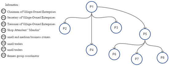 In-depth interviews aim to collect data in the form of information from informants. Information from the interviews can confirm and strengthen the observations researchers made at the beginning of field research. The initial informant is the first source of information and the gatekeeper for the researcher to meet the next informant. In this context, researchers first met informants, including the head of the village-owned enterprise (P1), then met the secretary (P2) and treasurer (P3) at the direction of the first informant. Like the secretary and treasurer, the researcher also met the officer in charge (P4) of the “Mandiri” shop, one of the units of the village-owned enterprise. Information continued to grow in line with the number of informants. The researcher had the opportunity to interview a small- and medium-sized business owner (P5) in the home industry sector around the village on the instructions of the previous informant (P1). Furthermore, the researcher met several small trader informants (P6 and P7) close to the village-owned enterprise unit’s “Mandiri” shop. The last informant was a coordinator of a farmers’ group (P8), cultivating vegetables on land around the village. The flow of field research informants looks like Figure 1.