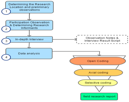 Qualitative data collection methods require researchers to be directly involved in the social setting of community groups at the research site. Bryman [61] divides the researcher’s participation in the social environment of the community into six forms. First, covert full member, where the researcher is fully involved in the social community group, but all group members must not realize they are being researched. Second, overt full member, where the researcher is fully involved in the social community group, but all group members realize they are being researched. Third, the participating observer is a researcher who involves himself in core activities in social groups rather than as a full member. Fourth, the partially participating observer, namely the researcher, involves himself in core activities in social groups, but the results of observations are only one of the data sources. Fifth, minimally participating observer, where the researcher makes low-intensity observations and does not participate in social group activities. From some of these classifications, researchers place themselves as participating observers when conducting field research.