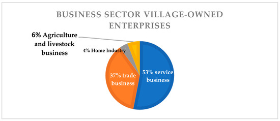 Observations and interviews showed that the trade shops, which are the village-owned enterprises’ business units, replicate the villagers’ grocery stalls. The village-owned enterprises run similar businesses to neighboring small businesses (Figure 4, 37% trade businesses). From a business perspective, this situation unconsciously has the potential to create competition between the two businesses. Ultimately, the orientation of village-owned enterprises as social enterprises and drivers of the village economy will also unconsciously shift. The business sector infographic of the village business entities is shown in the following image.