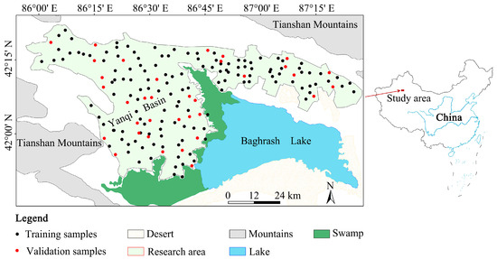 The Yanqi Basin was located in the middle parts of the Tianshan Mountain and the northeastern parts of the Tarim Basin in northwestern arid zones of China, with farmlands of about 213,000 ha and with an altitude within 1050–1250 m. The climate is a continental arid climate with mean annual temperature, precipitation, and evaporation of 10.88 °C, 70 mm, and 1900 mm, respectively. The main soil types include the brown desert soil, saline soil, and gypsum desert soil [28]. The main crops are pepper, tomato, and cotton.