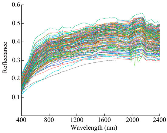 The spectral reflectance curves of 173 farmland soil samples were obtained (Figure 2). As shown in Figure 2, the spectral reflectance values of soil samples were between 0 and 0.6, and the visible light band was smaller than that of the near-infrared band, the difference was also slightly less than that of the near-infrared band. The spectral reflectance of the collected soil samples increased with the increase in the wavelength, the spectral reflectance increased rapidly within 400–600 nm, which is related to the iron contained in the soil [34]. The spectral reflectance within 600–2400 nm was relatively stable for the collected soil samples.