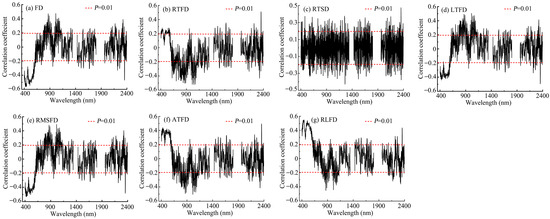 Overall, the spectral sensitive characteristics of SOM in the collected soil samples were distributed in the visible light band. Among the 15 types of spectral transformations, FD, RTFD, RTSD, LTFD, RMSFD, ATFD, and RLFD had obvious effects on enhancing the spectral characteristics of SOM in soil. The original spectral reflectance of the original reflectance showed a low correlation, with a coefficient of −0.385. However, following the application of 15 types of different spectral transformations, the correlation coefficient correspondingly improved. It suggests that performing spectral transformation on the original spectral reflectance data can effectively enhance the correlation between spectral reflectance data and SOM content.
