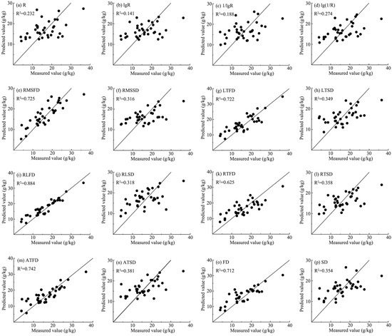 The ranges of the R2, RMSE, and MAE values inverted by SVMR were 0.118–0.350, 5.876–6.633%, and 4.456–5.271, respectively. R2 was lower than 0.35, and the highest R2 (0.350) was found in the ATFD transformation. It indicates that the SVMR model basically does not have estimation ability of the SOM content. In other words, the prediction ability of SVMR was poorer than PLSR.