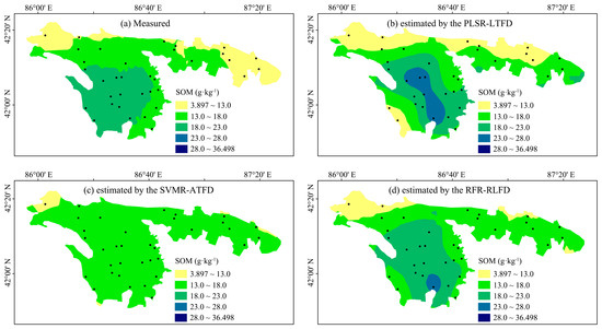Overall, the RFR-RLFD model proposed in this research can be applied to estimate SOM contents in other areas, especially farmland soils in arid zones. At the same time, due to the differences in regional locations, soil types, and pollution levels of soil, whether the best model is suitable for other soil types and regions needs further research. In addition, the present work only focused on the PLSR, RFR, and SVMR algorithms in the statistical analysis. Other powerful machine/deep learning methods, such as geographically weighted regression (GWR), artificial neural networks (ANNs), and naive Bayes (NB), could be assessed for their potential to further improve the prediction accuracy of organic matter contents of agricultural soils in arid zones.