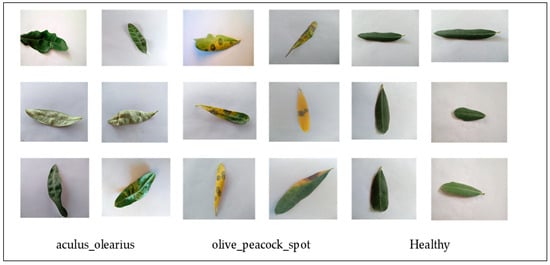 The model under consideration is rigorously tested and evaluated utilizing a dataset available at the link “https://github.com/sinanuguz/CNN_olive_dataset (accessed 11 September 2023)” This dataset comprises a curated collection of 3400 olive leaf images meticulously gathered from the Turkish city of Denizli during spring and summer. These images are thoughtfully classified into three distinct categories: those depicting leaves afflicted by Aculus olearius, those portraying olive spot disease-inflicted leaves, and images capturing the essence of healthy leaves. The characteristics of the images in this dataset are RGB colors with dimensions of 800 × 600. Table 1 illustrates the number of samples in each class of the dataset.