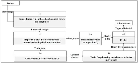In the proposed model, AI is harnessed to integrate clustering and deep learning, facilitating the identification of olive diseases through a comprehensive analysis of olive leaf images. Figure 1 shows the implementation scenario that was used in the proposed model.