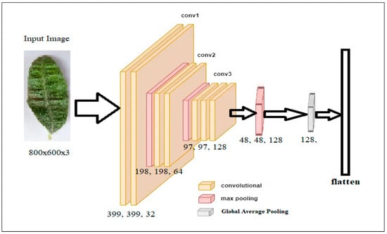 Here, Z is a feature representation of the input olive leaf image, holding the learned patterns and features of the disease diagnosis. A series of experiments resulted in selecting this specific architecture for feature extraction from the input image, chosen due to its superior performance over other alternatives. This architecture uses convolution to extract features from the image. It includes multiple layers, such as convolutional layers, max pooling layers, and a global average pooling layer. The input for this architecture is an RGB image with a resolution of 800 × 600 pixels. It consists of three layers of convolution, each followed by max pooling. The settings for each layer are as follows: