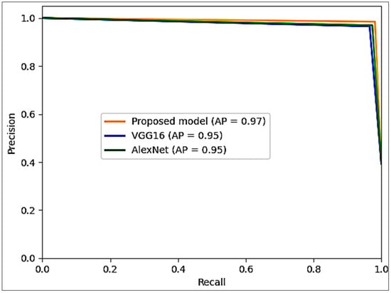 Figure 12 shows the comparative performance of the precision–recall curves for the three models: roposed model, AlexNet, and VGG16. These curves illustrate the interplay between precision and recall at different classification thresholds. The proposed model has a high precision and recall values curve, meaning it can identify positive instances while accurately minimizing false positives. The AlexNet and VGG16 curves show competing but slightly lower precision–recall values, highlighting their performance in capturing relevant samples. The visualization provides a nuanced perspective on the models’ efficiency in handling precision–recall dynamics.